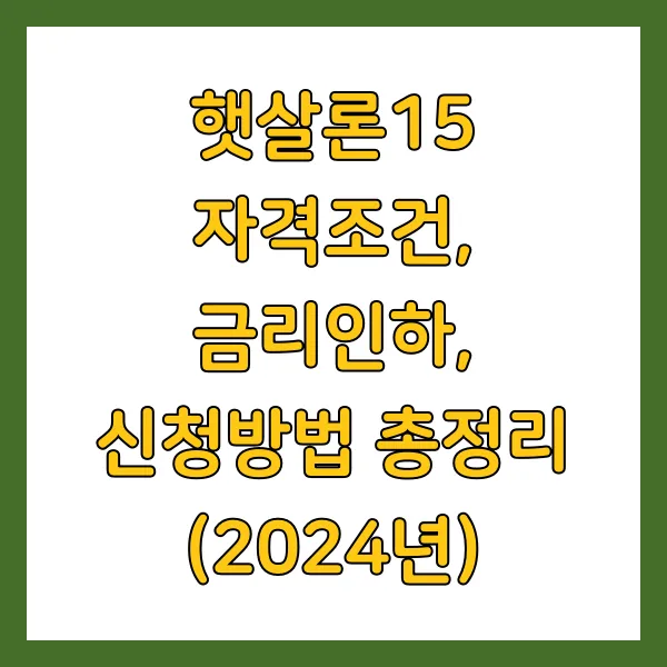 금융 사각지대에 놓인 저소득·저신용 서민들을 위한 든든한 지원책, 바로 햇살론15입니다! 2024년 최신 정보를 바탕으로 자격 조건, 금리 인하 혜택, 신청 방법, 유의사항까지 꼼꼼하게 정리했습니다. 햇살론15, 나에게 맞는 상품일까? 고민하고 계신다면 지금 바로 확인해보세요! 햇살론15 금리, 햇살론15 특례보증, 햇살론15 자격조건 등 햇살론15에 대한 모든 궁금증을 해결해 드립니다.
